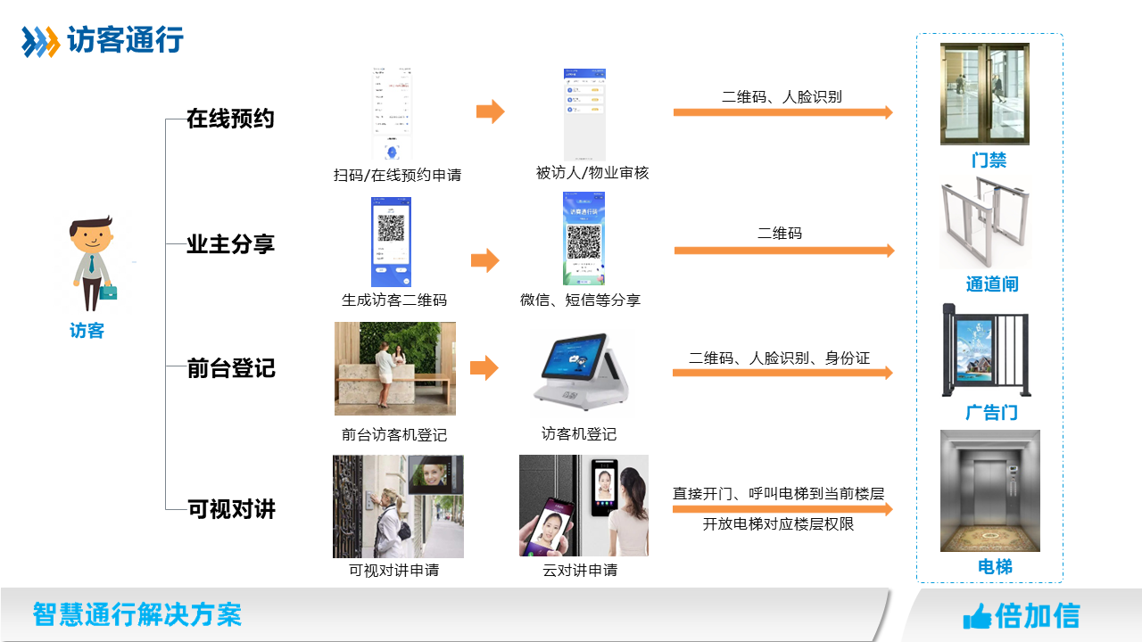 在住宅小區(qū)、寫(xiě)字樓、園區(qū)、企事業(yè)單位等場(chǎng)所,物業(yè)往往針對(duì)外來(lái)人員都需要管控,我司提供多種訪客通行解決方案,滿足不同場(chǎng)景訪客進(jìn)出物業(yè)管理需求。