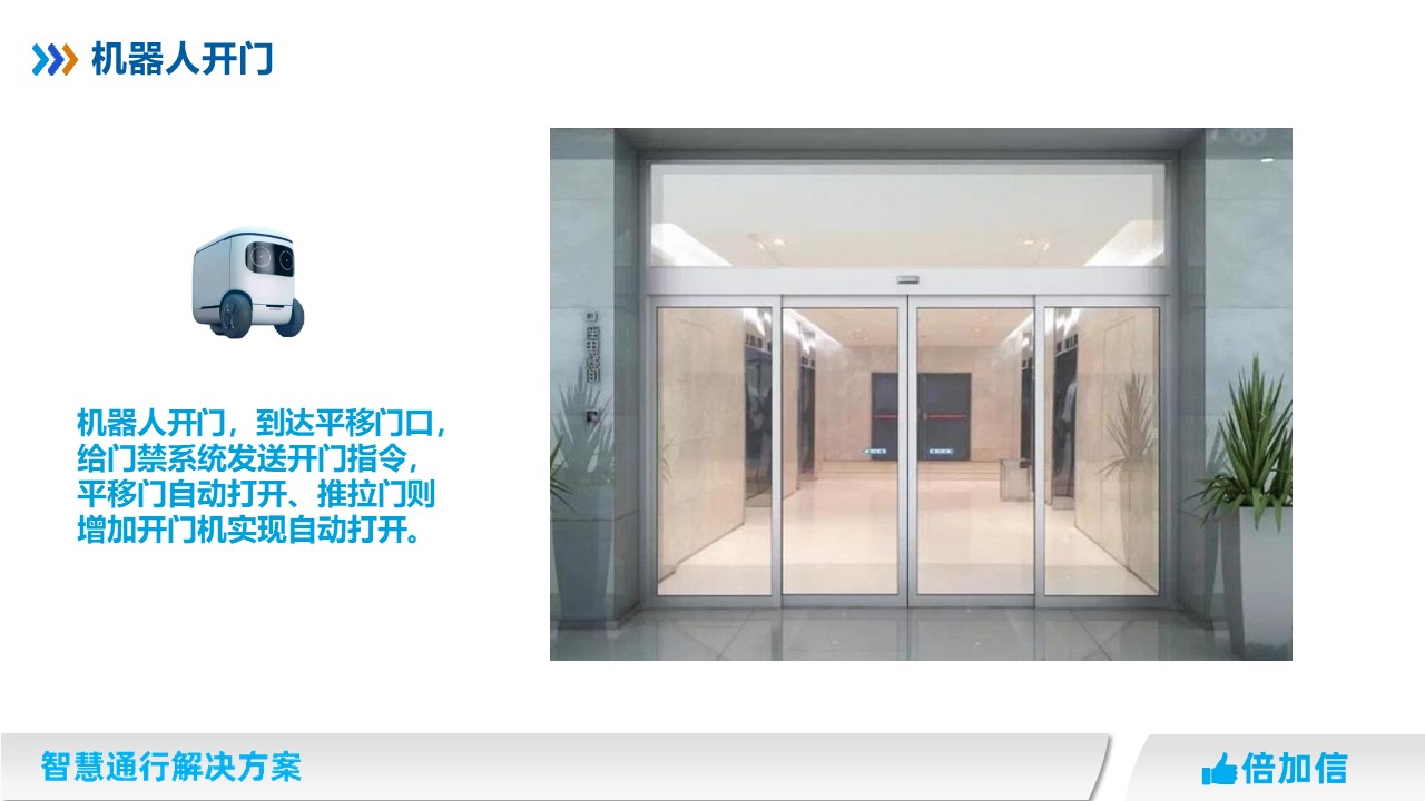 1、機器人發指令給我司門禁設備即可實現自動打開平移門、推拉門、通道閘;